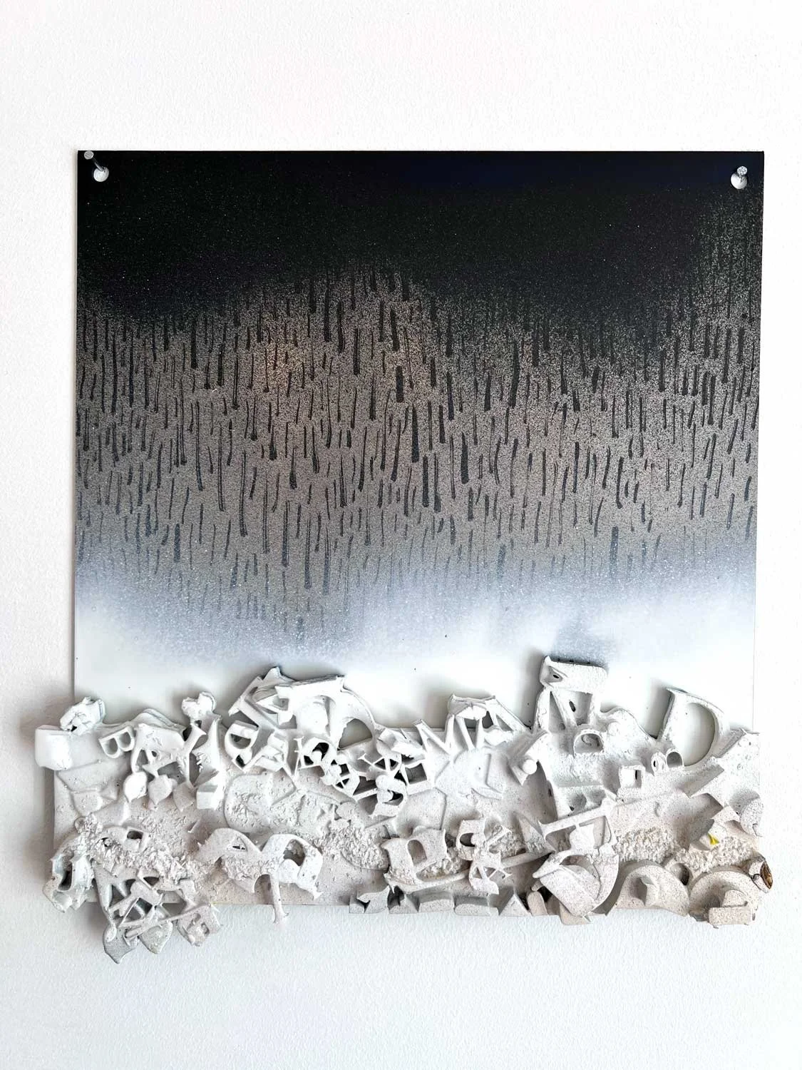 wood, aluminum, marker, spray paint, enamel paint, salt