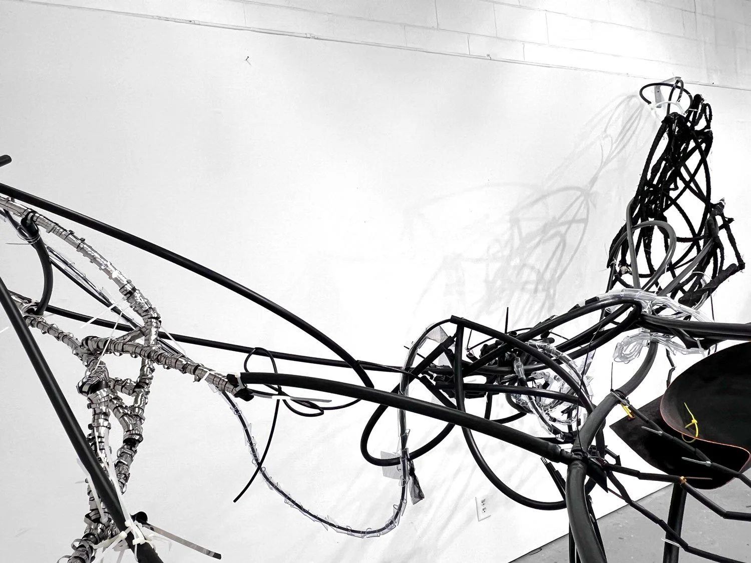 A sprawling web of various materials including irrigation components, steel ties, cotton canvas, and paper stretches across the space, visualizing the chaotic, formative energies of a stellar nursery.